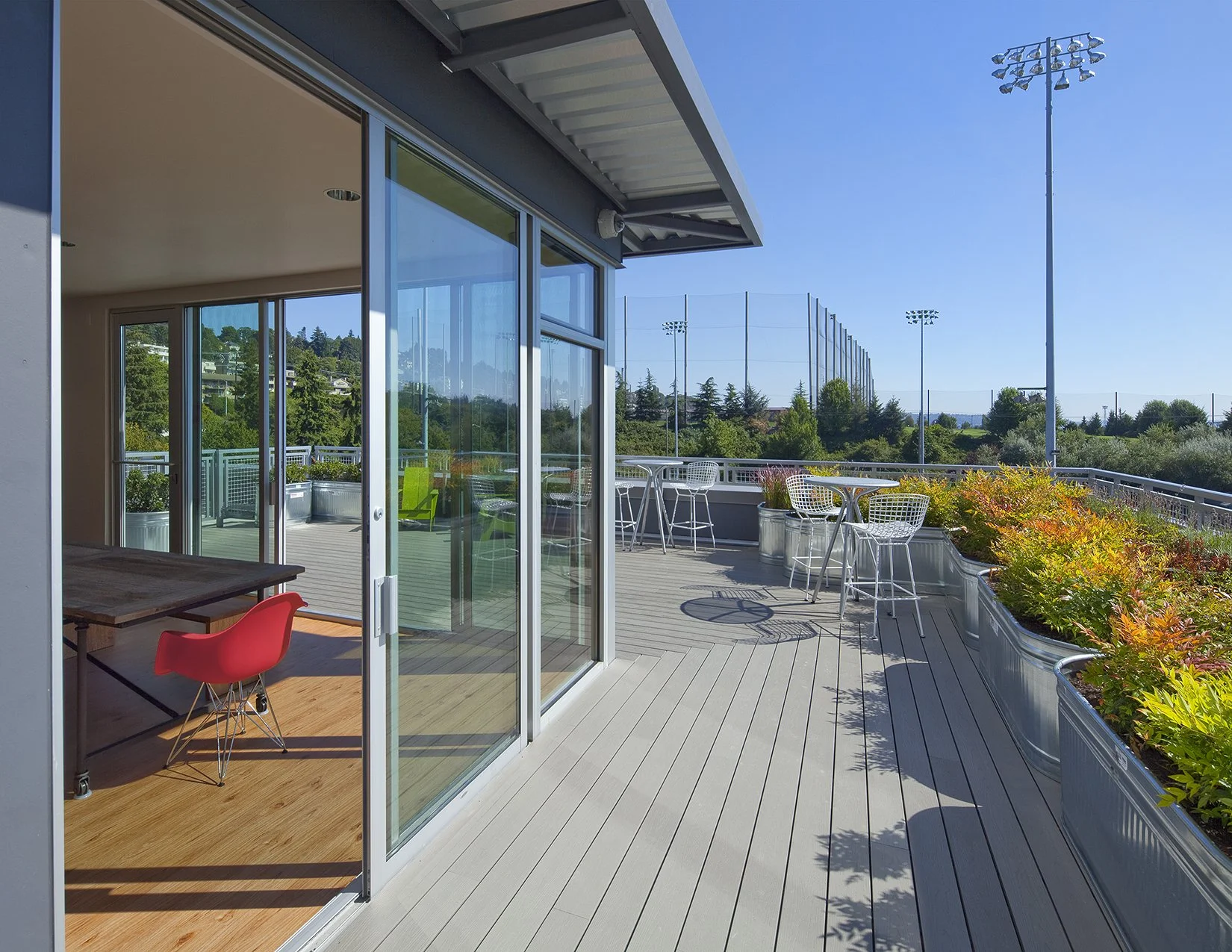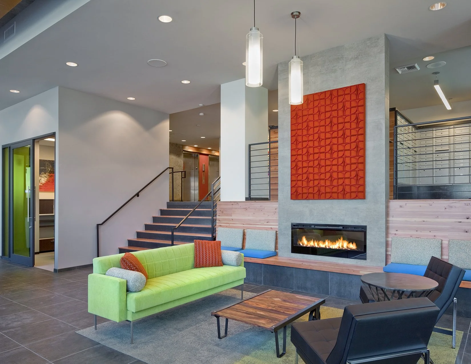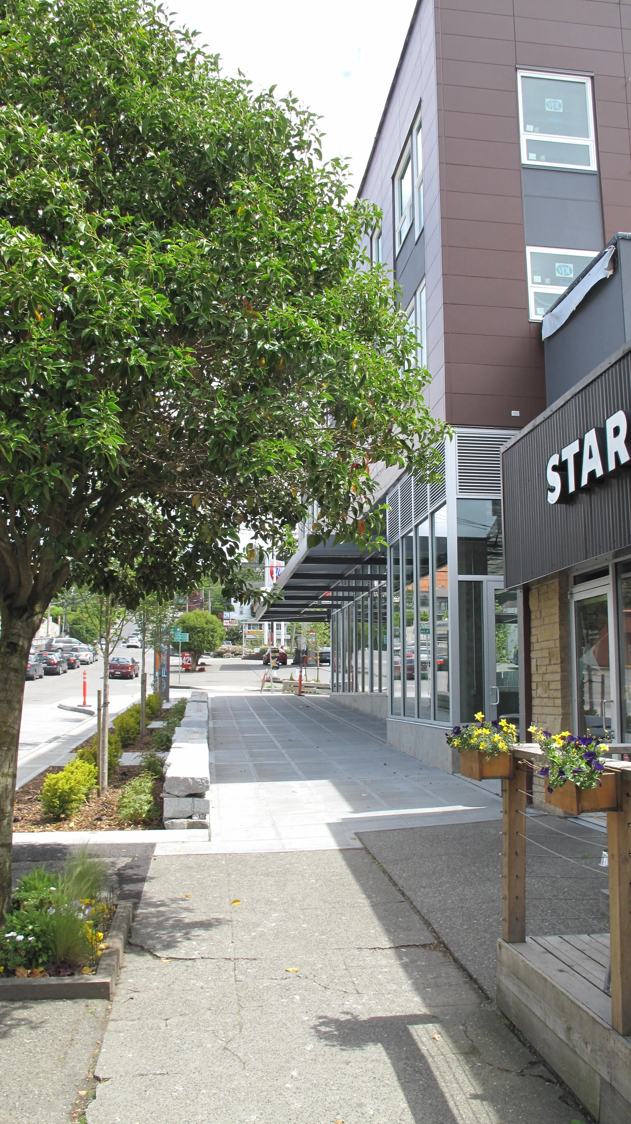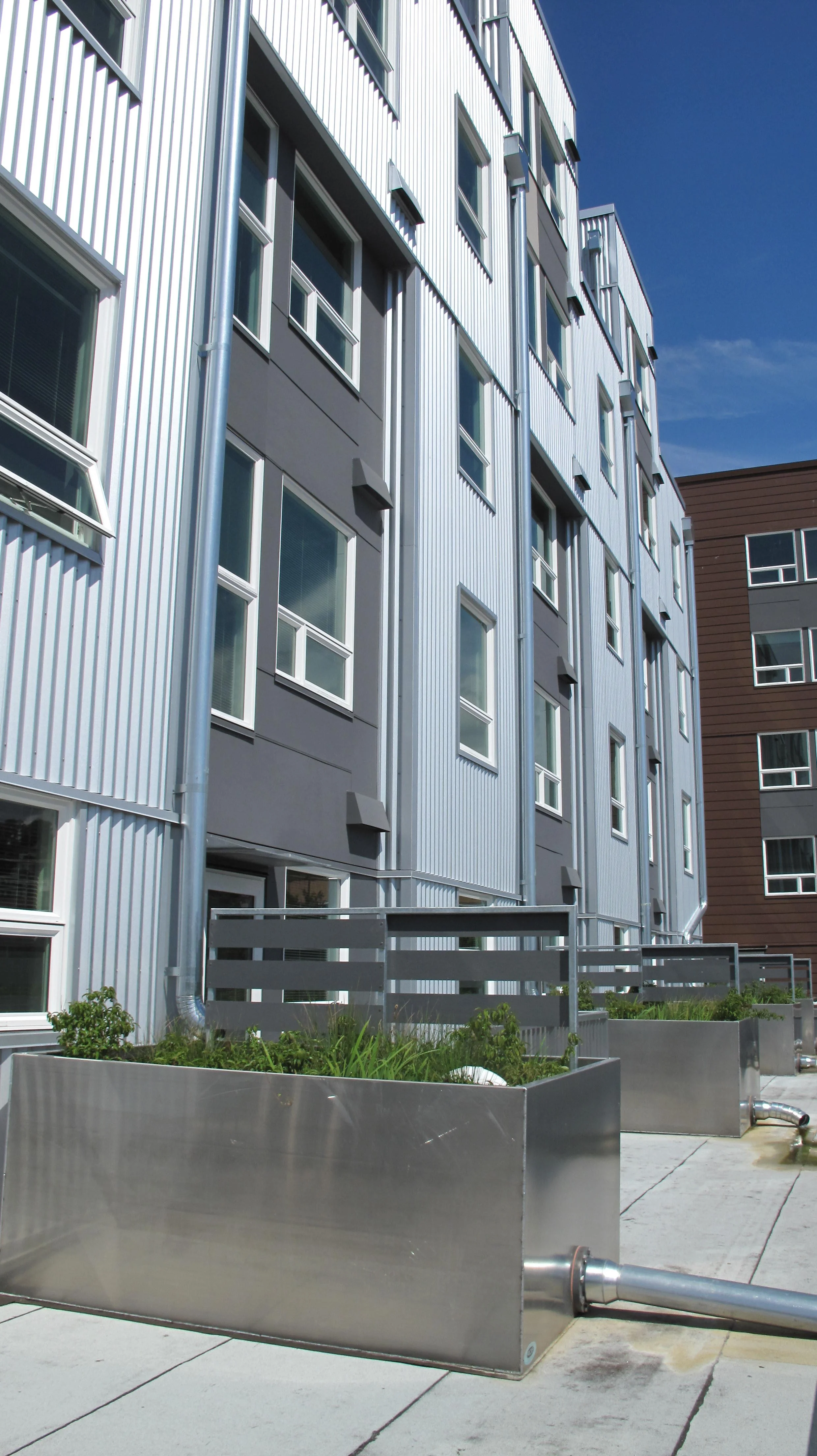 The 236-unit Slate Apartments creates a lively pedestrian environment and catalyst for future development in the Seattle industrial neighborhood of Interbay. Residential amenities include an indoor/outdoor community room, fitness room, media center, conference space, and gaming room. This multi-family and commercial building provides a gracious, pedestrian-oriented streetscape with street-level restaurant space and ground-level residential units. Rain gardens in the right-of-way provide a sustainable means of controlling stormwater, while enhanced landscaping, public seating, bike racks, and overhead canopies contribute to an attractive walking and gathering environment.